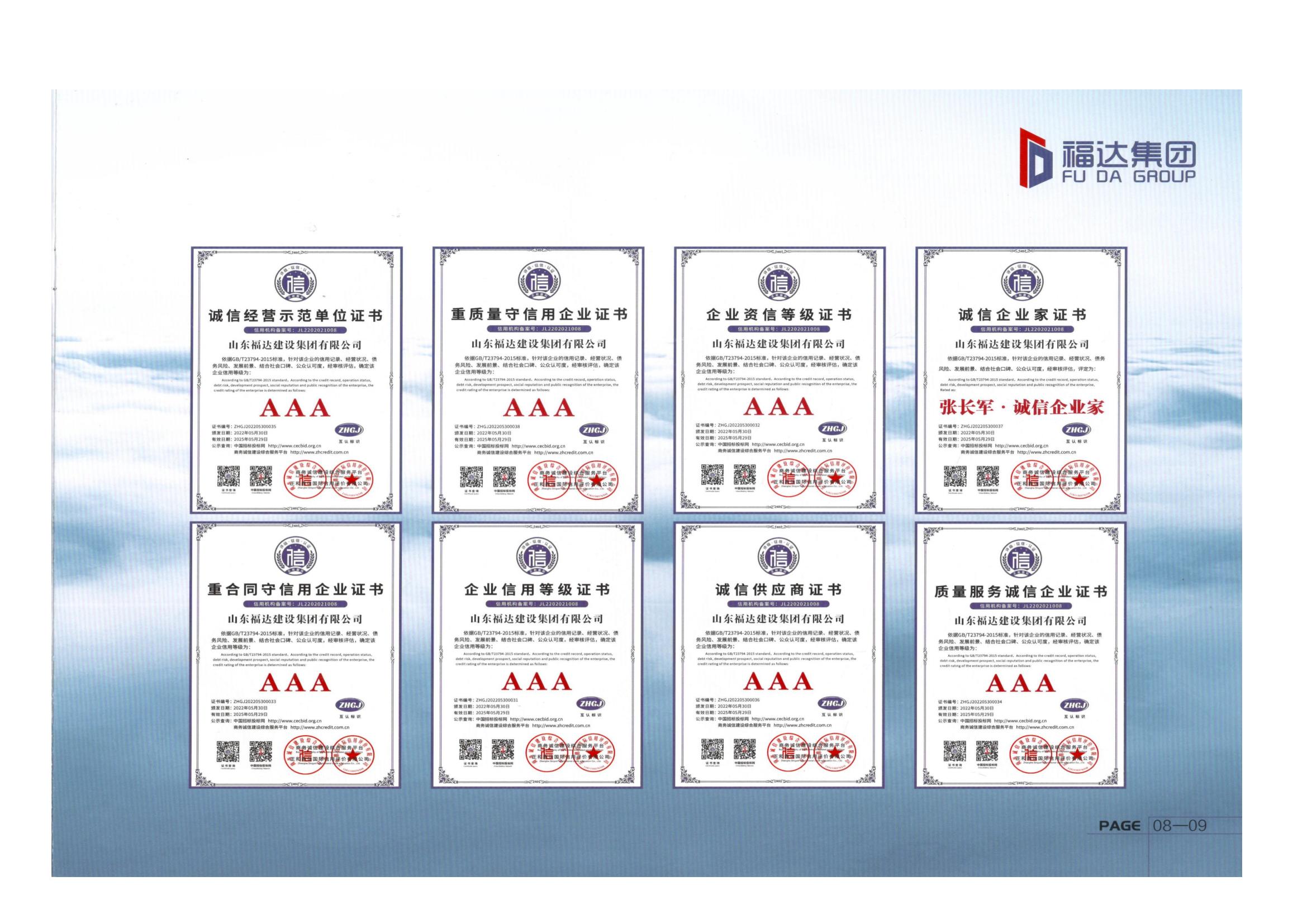 The company has complete qualifications, including Level 1 specialized contracting for steel structure engineering, Level 2 general contracting for building engineering construction, Level 2 specialized contracting for building decoration and decoration engineering, Level 2 specialized contracting for building curtain wall engineering, Level 3 general contracting for municipal public engineering construction, Level 3 specialized contracting for foundation engineering, Level 3 specialized contracting for environmental protection engineering, and Construction.The qualification certificate for labor services is not divided into grades and has passed the IS09001 quality, safety, and environmental system certification.